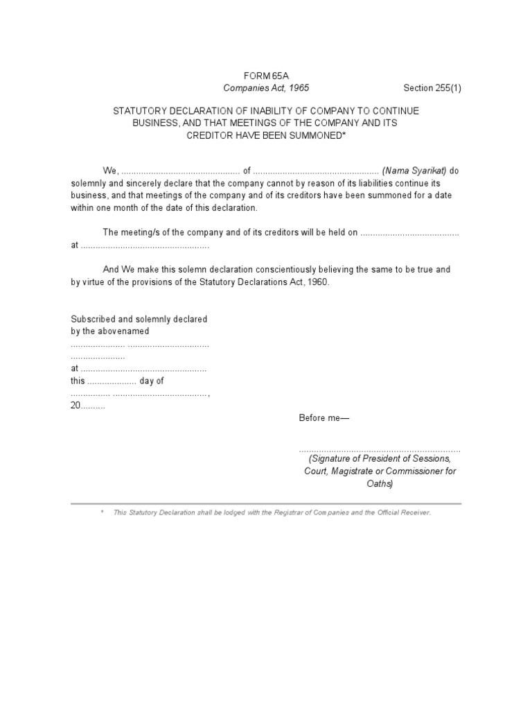 Form 65a Statutory Declaration Of Inability Of Company To Continue Business And That Meetings Of The Company And Its Creditor Have Been Summoned